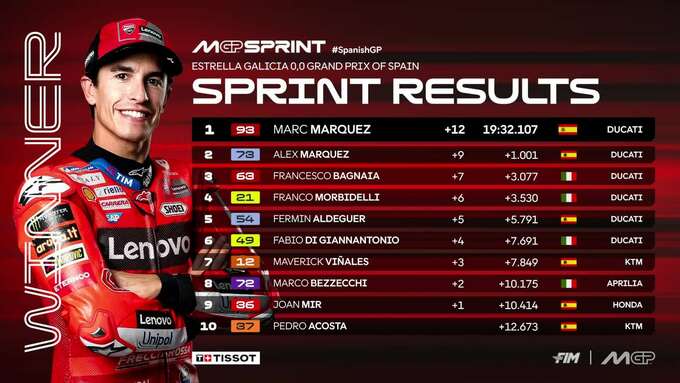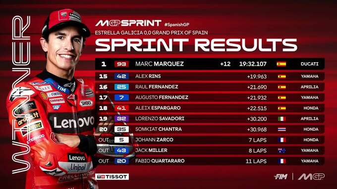 Стоит также отметить партнера Алекса Маркеса по частной команде Gresini Фермина Альдегера, который вторую гонку подряд и первый спринт в нынешнем сезоне завершает в топ-5.