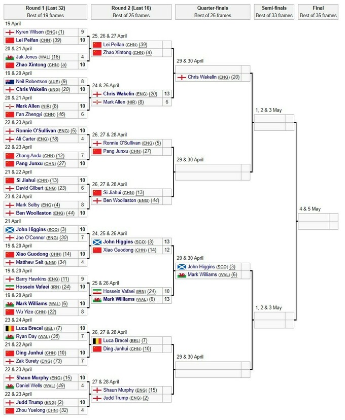 - 23:00. Джон Хиггинс (Шотландия) [3] – Сяо Годун (Китай) [14] – 13:12 (итог матча)