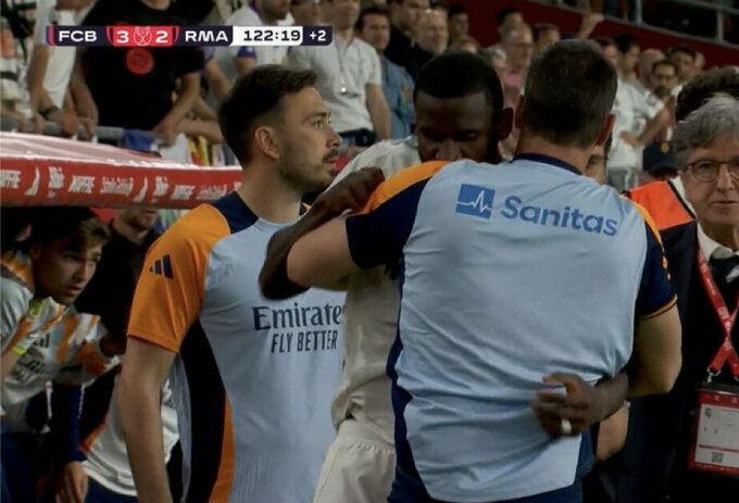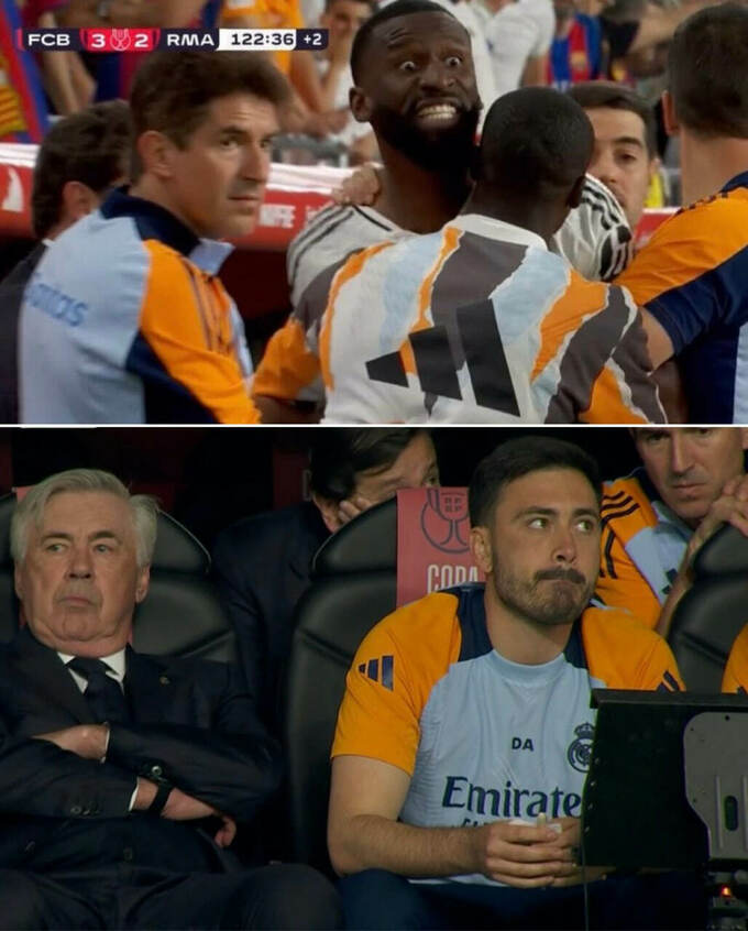 Решение судьи остановить матч и назначить штрафной для Барселоны понравилось не всем. Игроки Реала очень эмоционально отреагировали на этот эпизод, но всех переплюнул Антонио Рюдигер, который уже находился на скамейке для запасных [видео момента].