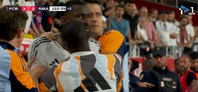 ФОТО. Его держали шестеро. Рюдигер обезумел в конце матча Барселона – Реал