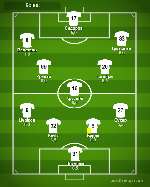 «Колос»: Пахолюк – Цуриков, Козик, Бурда, Сухарь (Демченко, 23) – Ррапай (Ориховский, 63), Красничи, Гагнидзе – Велетень, Третьяков (Алефиренко, 82), Сидоров (Ковталюк, 63)
