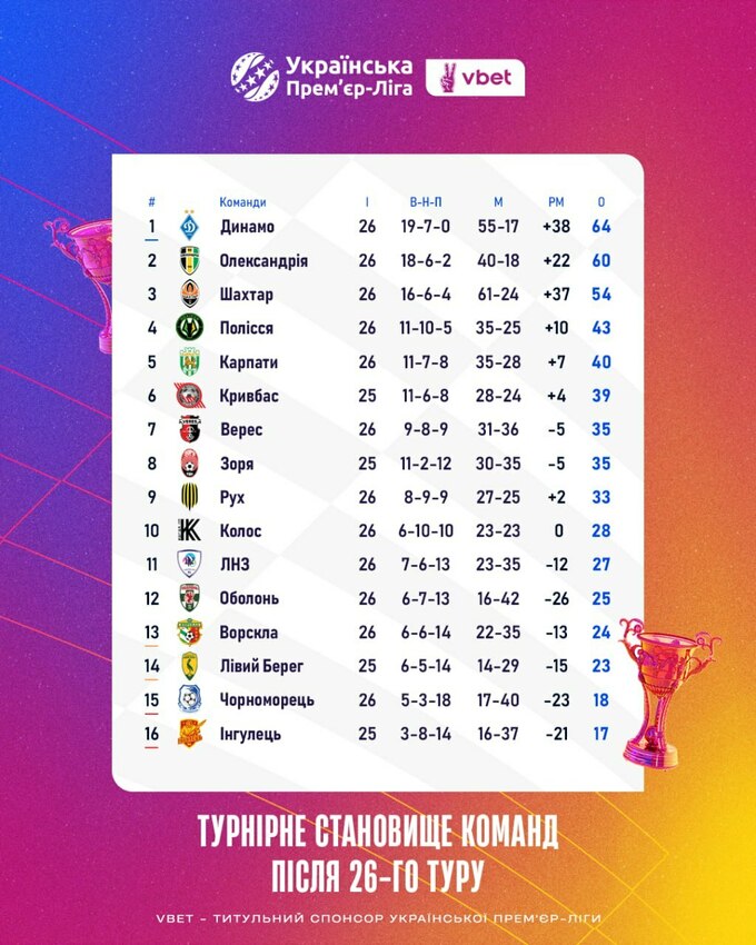 Динамо близко к чемпионству (64 очка), второе место занимает Александрия (60 пунктов), Шахтер идет третьим (54 балла).
