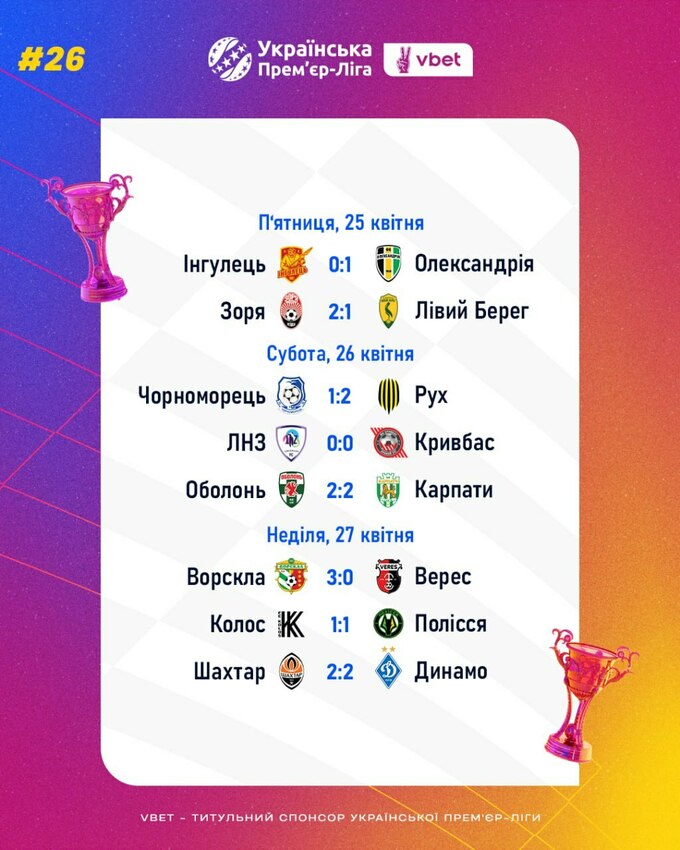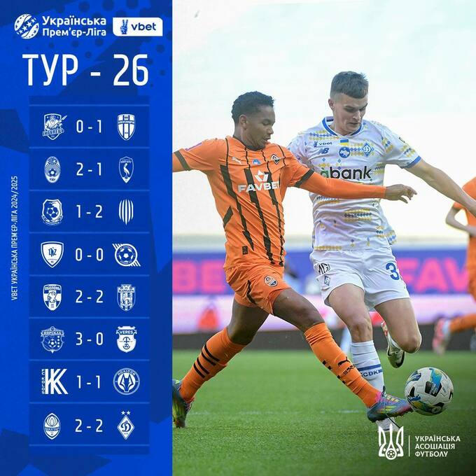 С 25 по 27 апреля состоялись матчи 26-го тура Украинской Премьер-лиги 2024/25.