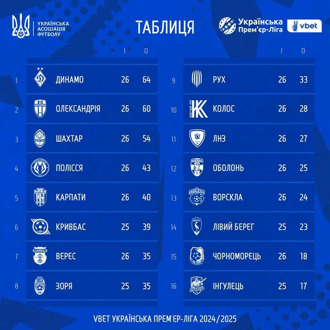 Топ-8 УПЛ: Динамо Киев (64), Александрия (60), Шахтер (54), Полесье (43), Карпаты (40), Кривбасс (39), Верес, Заря (по 35).