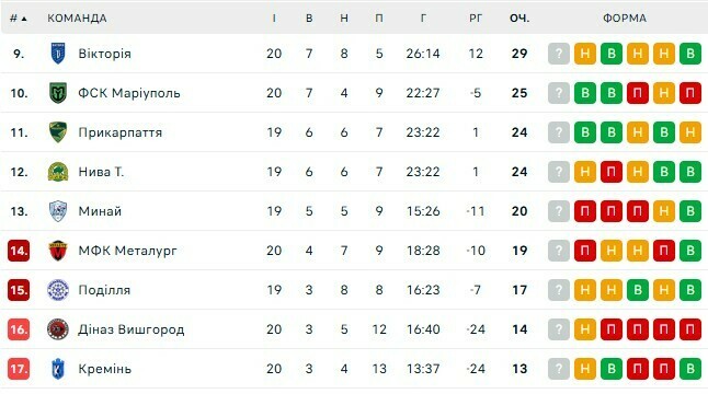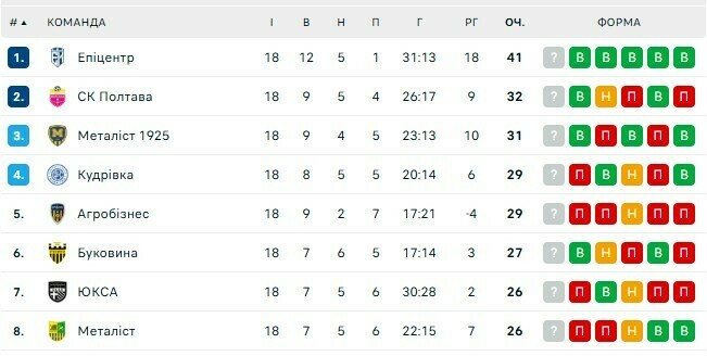 Топ-8: Эпицентр (41), Полтава (32), Металлист 1925 (31), Кудровка, Агробизнес (по 29), Буковина (27), ЮКСА, Металлист (по 26).