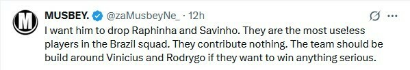 MUSBEY: Я хочу, чтобы он убрал Рафинью и Савиньо. Они самые бесполезные игроки в сборной Бразилии. Они ничего не привносят. Команда должна строиться вокруг Винисиуса и Родриго, если они хотят выиграть что-то серьезное.