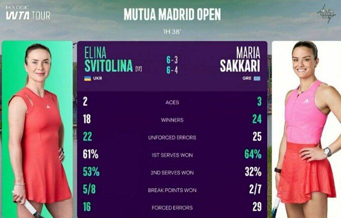 Помимо Элины, в Мадриде из представительниц Украины продолжает выступления и Марта Костюк. 29 апреля в 22:30 она начнет поединок 1/8 финала против Анастасии Потаповой.