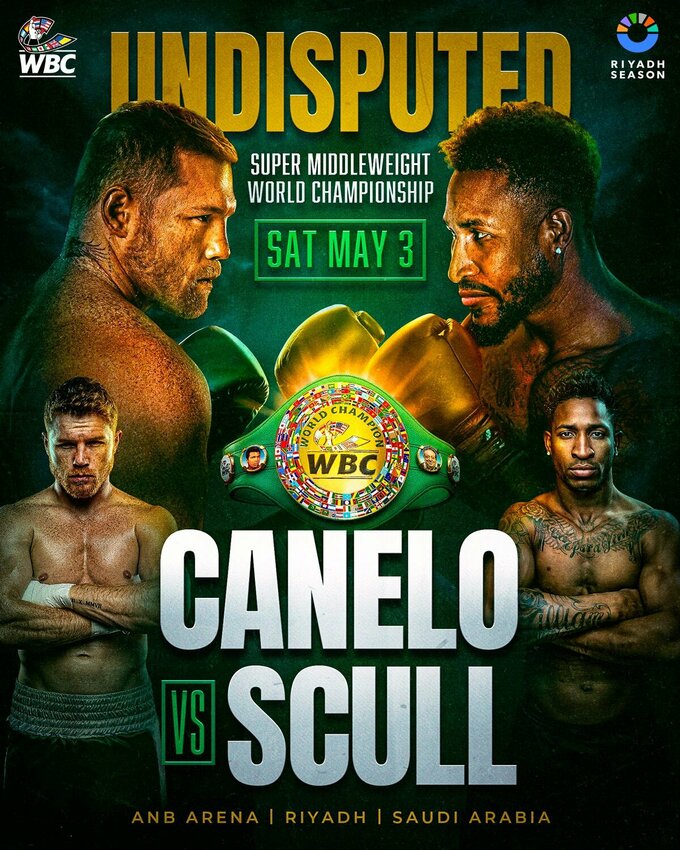 - Сауль Альварес (62–2–2, 39 KO) – Уильям Скалл (23–0, 9 KO). Бой за титулы чемпиона мира по версиям WBC, WBA, IBF и WBO во втором среднем весе (до 76,2 кг)