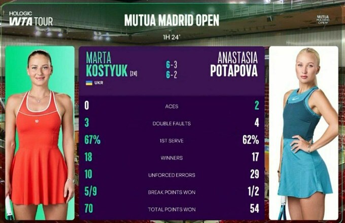 Марта Костюк (Украина) [24] – Анастасия Потапова – 6:3, 6:2
