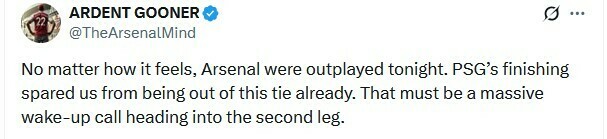 ARDENT GOONER: Как бы там ни было, сегодня вечером «Арсенал» переиграли. Реализация «ПСЖ» спасла нас от вылета из этой стычки. Это должно быть серьезным звонком перед ответным матчем.