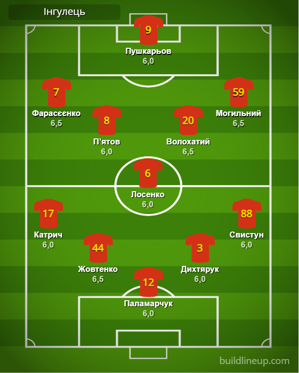 «Ингулец»: Паламарчук – Катрич, Жовтенко, Дыхтярук, Свистун – Лосенко – Могильный (Сад, 76), Пятов, Мохнатый, Фарасеенко – Пушкарев.