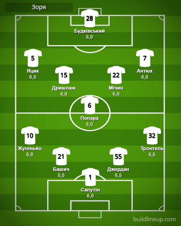 «Заря»: Сапутин – Жуниньо (Вантух, 71), Башич, Джордан, Тронтель – Дришлюк (Кораблин, 71), Папара, Мичин – Яцик, Будковский, Антюх.