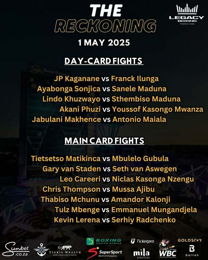 1 мая на арене «Sunbet Arena» в Претории (ЮАР) состоится вечер бокса, организованный промоутерской компанией Legacy Boxing Promotions.