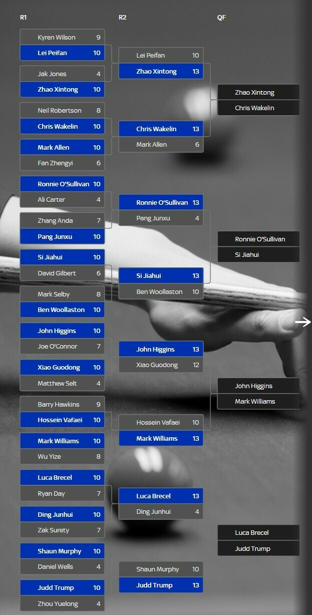 Вечером последнюю сессию проведут: Люка Бресель (Бельгия) – Джадд Трамп (Англия) [3:5], Ронни О'Салливан (Англия) – Си Цзяхуэй (Китай) [6:2].