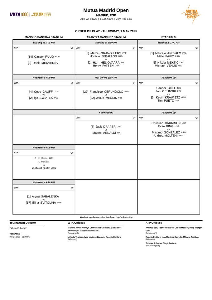 Расписание полуфинальных матчей на турнире WTA 1000 в Мадриде