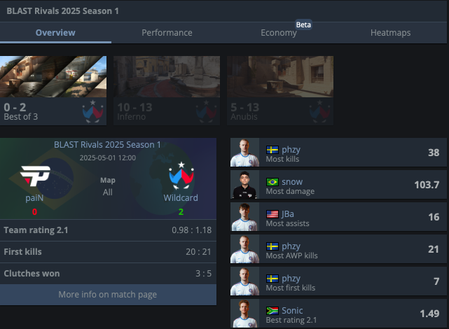 Команда Wildcard прошла в четвертьфинал турнира BLAST Rivals Season 1, уверенно обыграв paiN со счётом 2:0. Бразильцы, которые до сих пор не одержали ни одной победы с Франко «dgt» Гарсией, показали борьбу на Inferno, которая получилась довольно хаотичной с обеих сторон, но были полностью беззубыми на Anubis, едва избежав поражения со счётом 0:13.