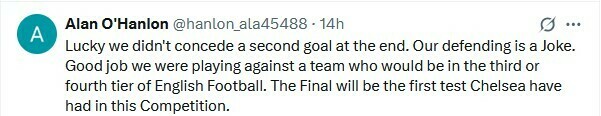 Alan O'Hanlon: Повезло, что мы не пропустили второй гол в конце. Наша защита – это шутка. Хорошо, что мы играли против команды, которая будет в третьем или четвертом дивизионе английского футбола. Финал станет первым испытанием для «Челси» в этом турнире.
