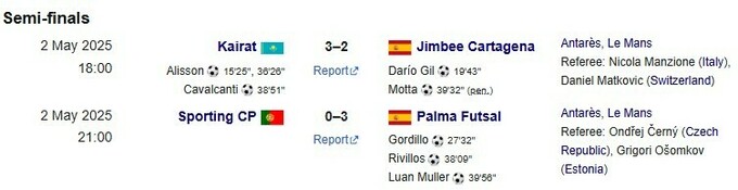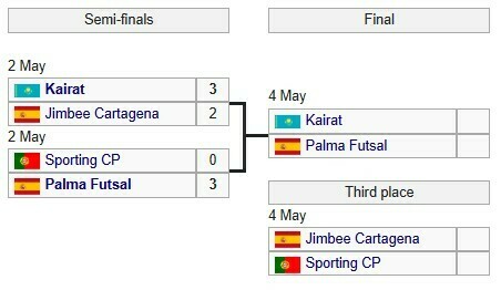 Финальный матч между командами Пальма Футзал и Кайрат Алматы состоится вечером 4 мая в 21:00 по Киеву. Матч за третье место между Джимби Картахена и Спортингом начнется в тот же день в 18:00.