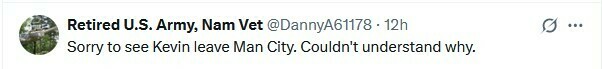 Retired U.S. Army, Nam Vet: Жаль, что Кевин покидает «Манчестер Сити». Не могу понять, почему.