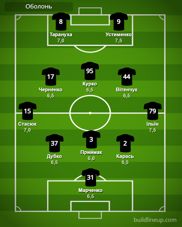 «Оболонь»: Марченко – Стасюк, Дубко, Приймак, Карась, Ильин – Черненко (Груша, 57), Курко (Мороз, 73), Витенчук (Слободян, 80) – Тарануха (Бычек, 57), Устименко (Близниченко, 57).