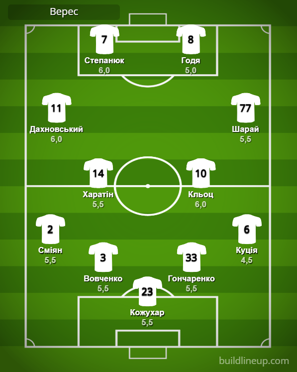«Верес»: Кожухарь – Смиян (Шевченко, 80), Вовченко, Гончаренко, Куция – Харатин, Клец (Венделл, 67) – Дахновский, Шарай (Луан, 62) – Степанюк (Гайдучик, 62), Годя (Протасевич, 46).