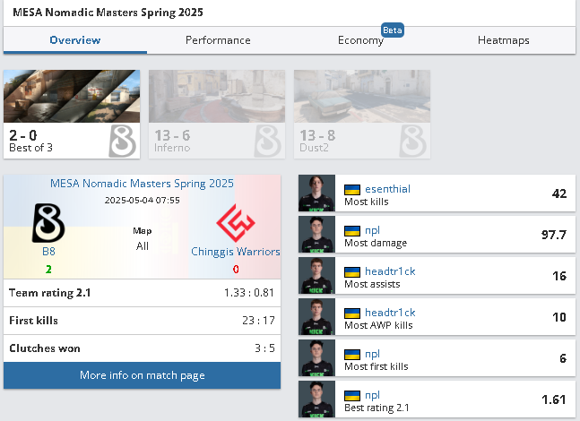 Вторая карта — Dust2. Здесь украинцы снова показали высокий уровень игры и победили со счётом 13:8. В первой половине, играя за атаку, B8 взяли восемь раундов против пяти у соперников. Во второй половине, уже играя в защите, команда довела матч до победы, выиграв ещё пять раундов, тогда как Chinggis Warriors взяли три.