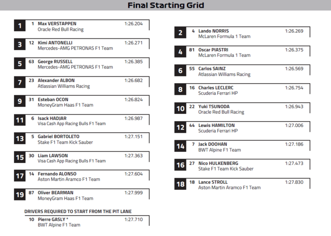 Во вчерашней квалификации поул добыл Макс Ферстаппен из команды Ред Булл, показав время 1:26.204. Вторым и третьим стали пилоты Макларена и Мерседеса – Ландо Норрис и Кими Антонелли.