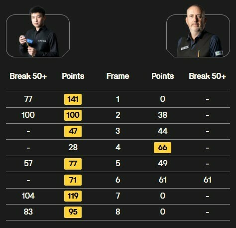 Но на этом позитив для Марка закончился. В пятом фрейме он набрал лишь 27 очков и не смог продолжить атаку после подбития кластера, тогда как Чжао ответил результативной серией в 57 очков.