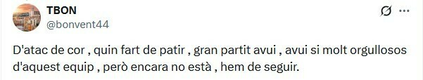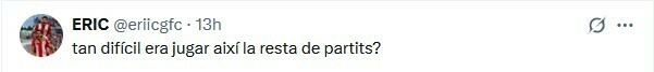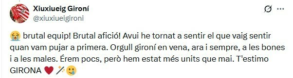 Xiuxiueig Gironí: Брутальная команда! Брутальные фанаты! Сегодня я снова почувствовал то, что чувствовал, когда мы вышли в первый дивизион. Гордость за Жирону в моих венах, сейчас и всегда, в хорошие и плохие времена. Нас было мало, но мы были сплоченнее, чем когда-либо. Я люблю тебя, ЖИРОНА.