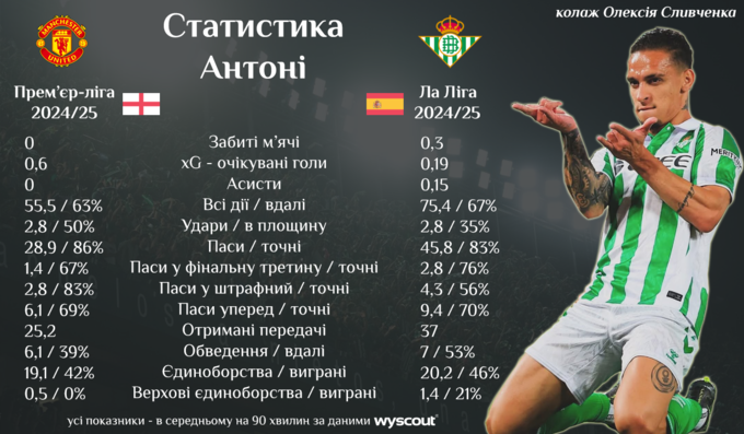 Антони за этот период сыграл 13 матчей в Ла Лиге, в которых сумел отличиться 4 голами и 2 результативными действиями. После 8 безголевых и откровенно серых поединков в первой части сезона за «Манчестер Юнайтед», в которых бразилец не забивал и не ассистировал, и в целом провел на поле суммарно только 135 минут, это выглядит однозначно как огромный прорыв.
