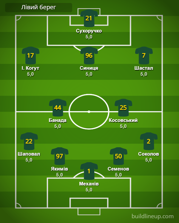 «Левый Берег»: Механов – Шаповал, Якимов, Семенов, Соколов – Банада, Косовский (Приходько, 51) – И. Когут (Войцеховский, 46), Синица (Диего, 57), Шастал (Галас, 51) – Сухоручко.