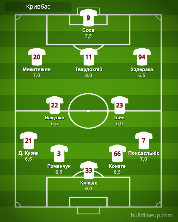 «Кривбасс»: Клищук – Д. Кузык, Романчук, Конате, Понедельник (Бандейра, 80) – Вакулко (Икенна, 72), Илич (Лунев, 46) – Микитишин (Ндомбази, 61), Твердохлеб, Задерака – Соса (Гонсалез, 80).