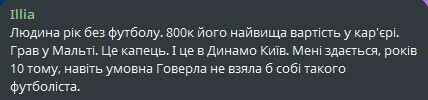 Illia: Человек год без футбола. 800к его самая высокая стоимость в карьере. Играл на Мальте. Это капец. И это в Динамо Киев. Мне кажется, лет 10 назад даже условная Говерла не взяла бы себе такого футболиста.