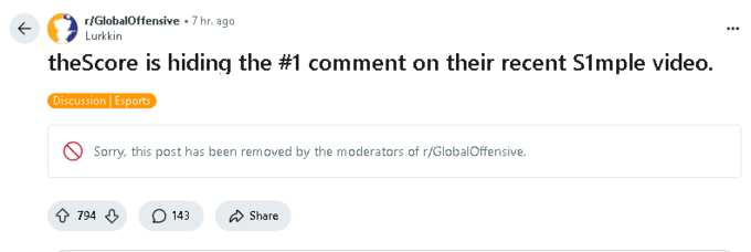 Кроме того, Lurkkin и несколько других пользователей обратили внимание на то, что theScore активно удаляет комментарии, в которых упоминается война или речь s1mple на IEM Katowice 2022, где он призывал к миру. Это вызывает подозрения, что канал сознательно избегает любых «политических» тем, даже если они напрямую касаются главного героя сюжета.