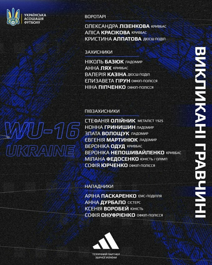 Украина WU-16: Лизенкова, Пипченко, Лях, Казина, Одуд, Гринишин (к), Олийник (Волощук, 37, Дурбало, 85), Юрченко (Непошивайленко, 62), Паскаренко, Воробей, Онуфриенко.