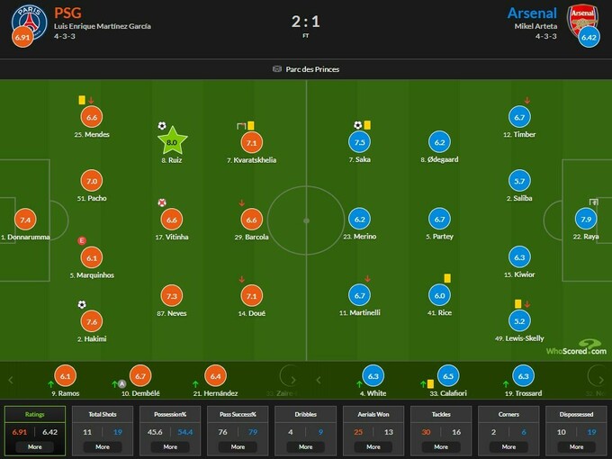 Кто получил восьмерку? Выставлены оценки за матч ПСЖ и Арсенала в ЛЧ