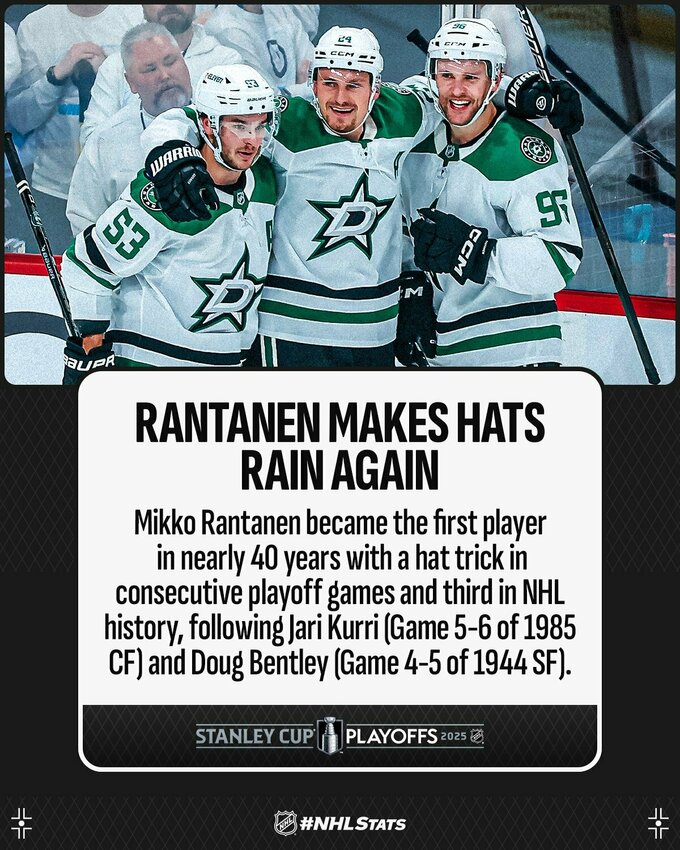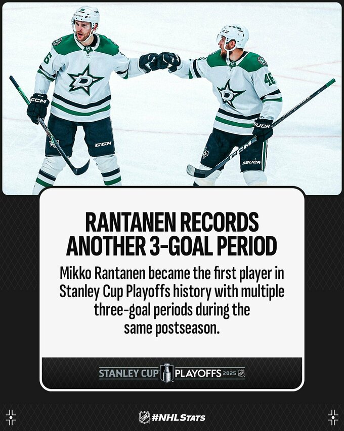 В последних 12 заброшенных шайбах Далласа в плей-офф Микко Рантанен отметился результативным действием. Это является теперь самой длинной подобной серией в истории Кубка Стэнли. Предыдущее достижение принадлежало Марио Лемье, который имел в своем активе 9 результативных действий подряд.