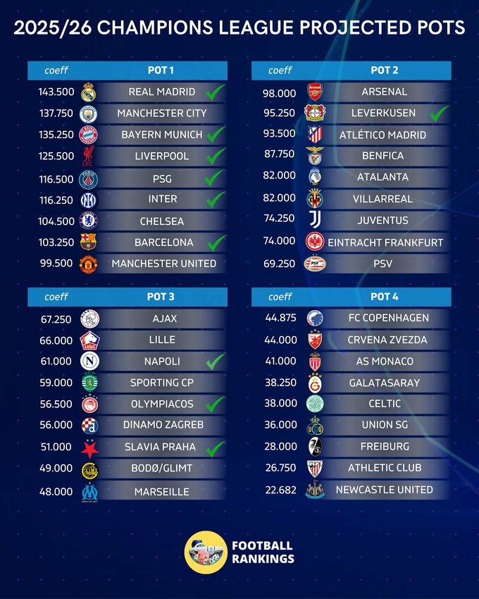 Лига чемпионов 2025/26. Прогнозируемые корзины посева
