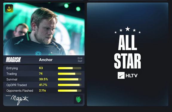Таким образом, в команду попал Эмиль «Magisk» Райф. Хотя он уже не демонстрирует форму времён 2016–2019 годов, ему удалось серьёзно повлиять на результат в ключевых моментах. В матче против Spirit он показал рейтинг 1.18, а в овертайме против MOUZ стал лучшим игроком встречи с показателем 1.34. На фоне слабой конкуренции этого хватило, чтобы попасть в символическую пятёрку.