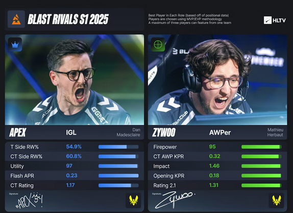 Киберспортивный портал HLTV представил символическую сборную лучших игроков турнира BLAST Rivals, теперь под брендом «All Star lineup» – вместо привычной «Best Five». В нее вошли обладатели индивидуальных наград: Матье «ZywOo» Эрбо, Робин «ropz» Кул и Даниил «donk» Крышковец.