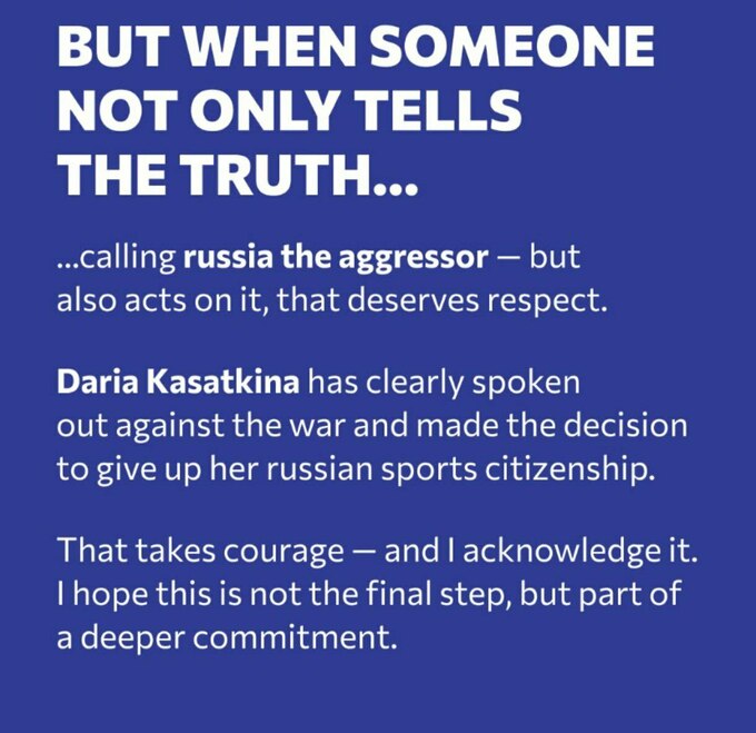 Дарья Касаткина четко высказалась против войны и приняла решение отказаться от российского спортивного гражданства. Для этого нужна смелость, и я это признаю. Я надеюсь, что это не последний шаг, а часть более глубокого обязательства.