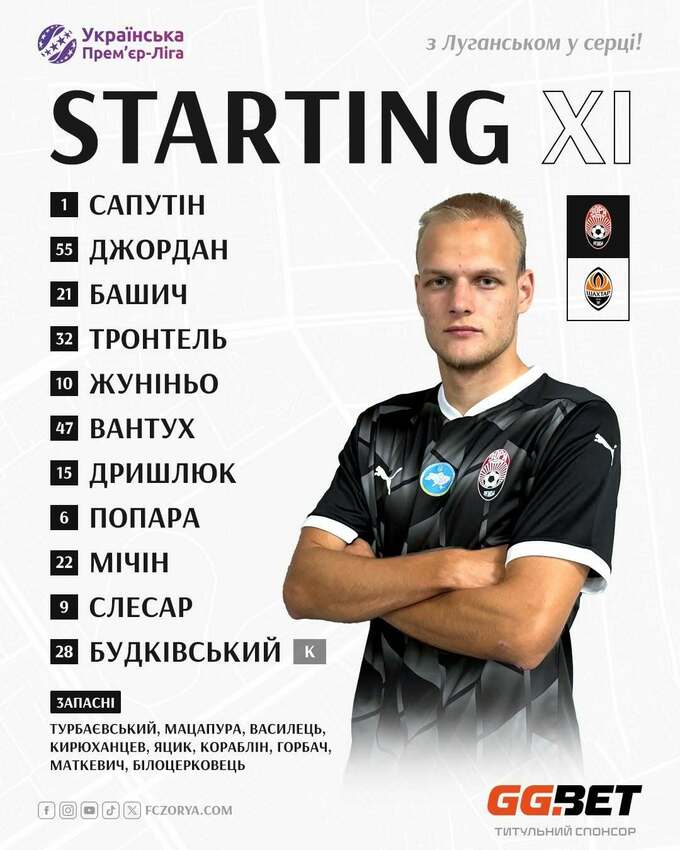 Заря: Сапутин – Тронтель, Джордан, Башич, Жуниор Рейс – Дрышлюк – Слесар, Мичин, Попара, Вантух – Будковский