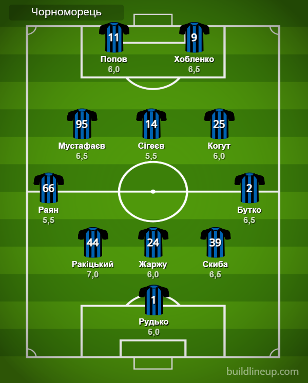 «Черноморец»: Рудько – Раян, Ракицкий, Жаржу, Скиба, Бутко – Мустафаев (Габелок, 80), Сигеев (Ермаков, 66), Когут (Робакидзе, 80) – Попов (Шевцов, 66), Хобленко (Пшеничнюк, 90+2).