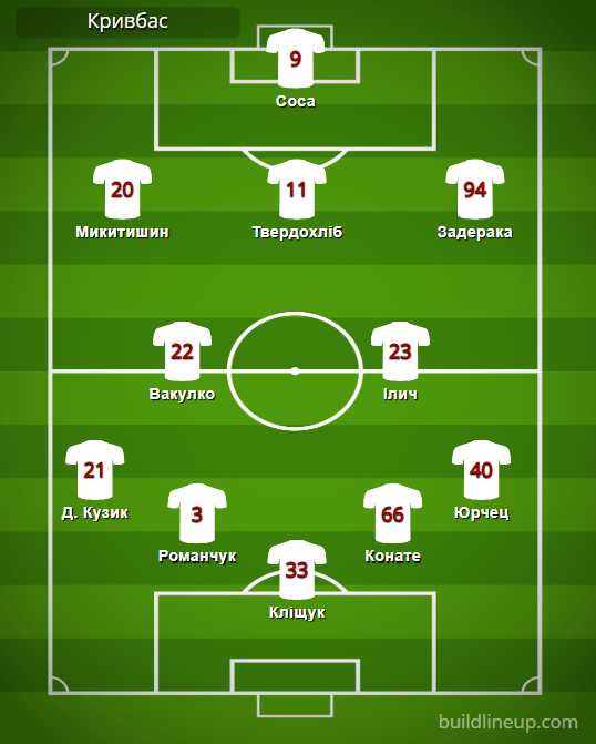 «Кривбасс»: Клищук – Д. Кузык, Романчук, Конате, Юрчец – Вакулко, Илич (Лунев, 74) – Микитишин (Бандейра, 85), Твердохлеб (Ндомбази, 74), Задерака – Соса (Гонсалез, 85).