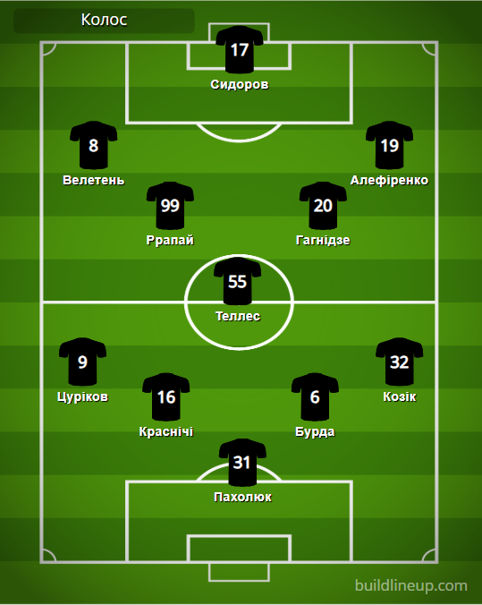 «Колос»: Пахолюк – Цуриков, Красничи, Бурда, Козик – Ррапай (Ореховский, 81), Теллес (Демченко, 81), Гагнидзе – Велетень, Сидоров (Ковталюк, 57), Алефиренко (Третьяков, 67).