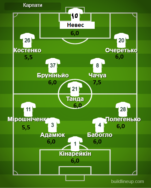«Карпаты»: Кинарейкин – Полегенько, Адамюк, Бабогло, Мирошниченко – Танда, Чачуа (Клименко, 90+7) – Очеретько (Квасница, 67), Бруниньо (Федор, 74), Костенко (Шах, 74) – Невес (Краснопир, 67)