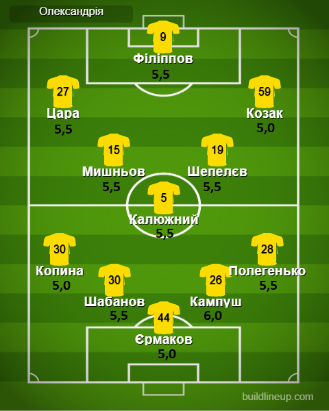 «Александрия»: Ермаков – Кравченко, Шабанов, Кампуш, Копына – Калюжный, Мышнев (Ковалец, 74) – Козак (Джевани, 66), Шепелев (Смирный, 66), Цара (Беляев, 66) – Филиппов (Кулаков, 86)