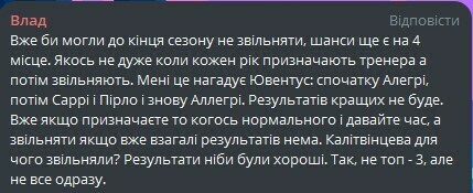 Влад: Уже могли бы до конца сезона не увольнять, шансы еще есть на 4 место. Как-то не очень когда каждый год назначают тренера, а потом увольняют. Мне это напоминает Ювентус: сначала Аллегри, потом Сарри и Пирло и снова Аллегри. Результатов лучше не будет. Уж если назначаете то кого-то нормального и давайте время, а увольнять если уж вообще результатов нет. Калитвинцева для чего увольняли? Результаты вроде бы были хорошие. Да, не топ – 3, но не все сразу.
