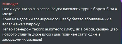 Manager: Неожиданное, конечно, заявление. За два важных тура в борьбе за 4 место... Хотя недостатками тренерского штаба многие болельщики взывали уже с полгода. Теперь тренером такого амбициозного клуба, как Полесье, руководство которого ставит очень высокие цели, должен стать один из зарубежных специалистов!