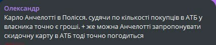 Олександр: Карло Анчелотти в Полесье. Судя по количеству покупателей в АТБ, у собственника точно есть деньги. + же можно Анчелотти предложить скидочную карту в АТБ, тогда точно согласится.